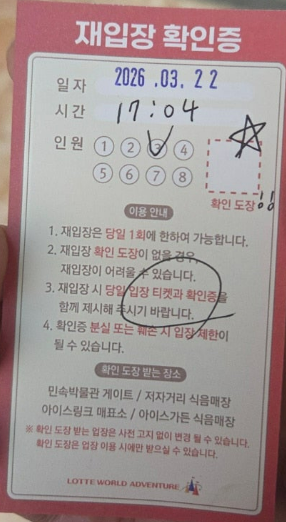 출근에서 재입장 확인권을 받아서 아이스링크장에서 도장을 받으시면 되요.