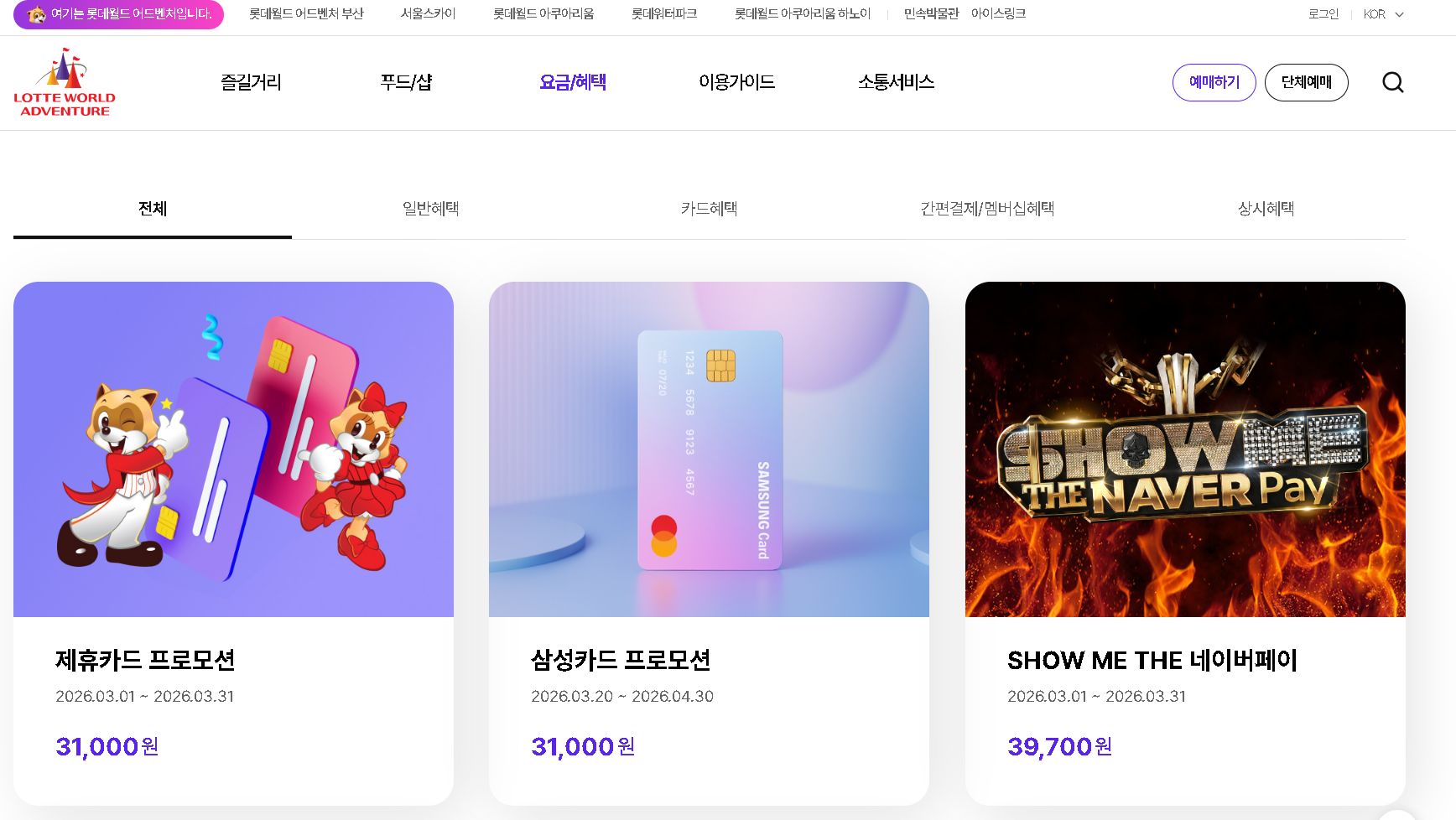 매월 이벤트 혜택도 있어, 어떤것이 더 저렴한지 비교해보시고 선택해서 할인받으시면 3만원대에 입장가능합니다.