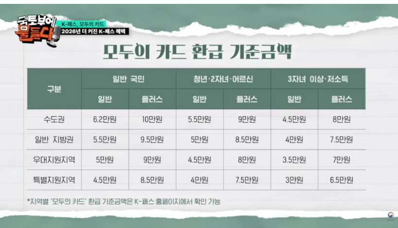 정부가 추진하는 교통비 환급 지원 카드 정책으로, 2026년부터는 전국적으로 확대되며 기존 K-패스보다 더 유리하게 운영돼요.